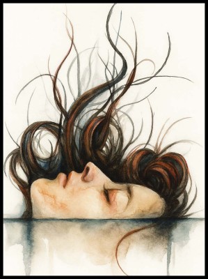 Przedstawia kobiecą twarz wynurzającą się lub zanurzającą w wodzie, z włosami falującymi niczym morskie prądy.
