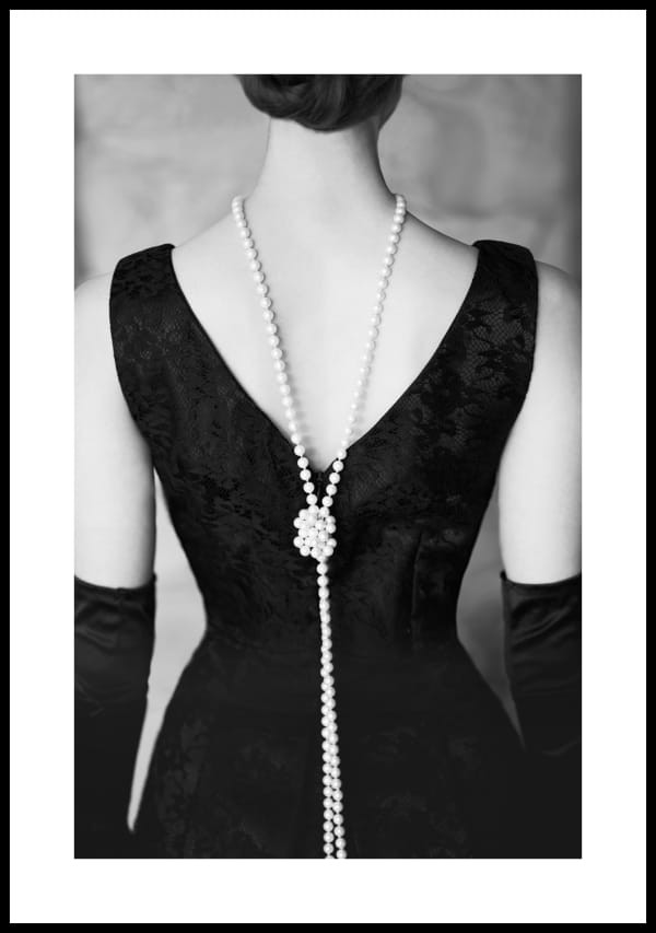 Bardzo elegancki plakat fotograficzny. Kobieta ma na sobie perły co podkreśla styl.