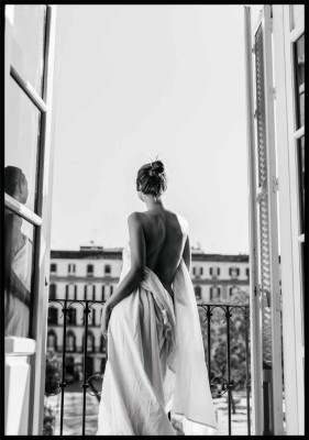 Odważna i jednocześnie elegancka fotografia nawiązująca do stylu dawnych francuskich gwiazd kina. Tajemnicza postać na balkonie, przysłonięta jedynie prześcieradłem, prezentuje subtelne kobiece piękno. Zdjęcie może być ozdobą salonu, jadalni, pracowni, łazienki czy korytarza. Dopełnieniem takiej dekoracji będą inne akcenty w kolorze białym lub czarnym kojarzące się z Francją i jej stolicą - Paryżem.