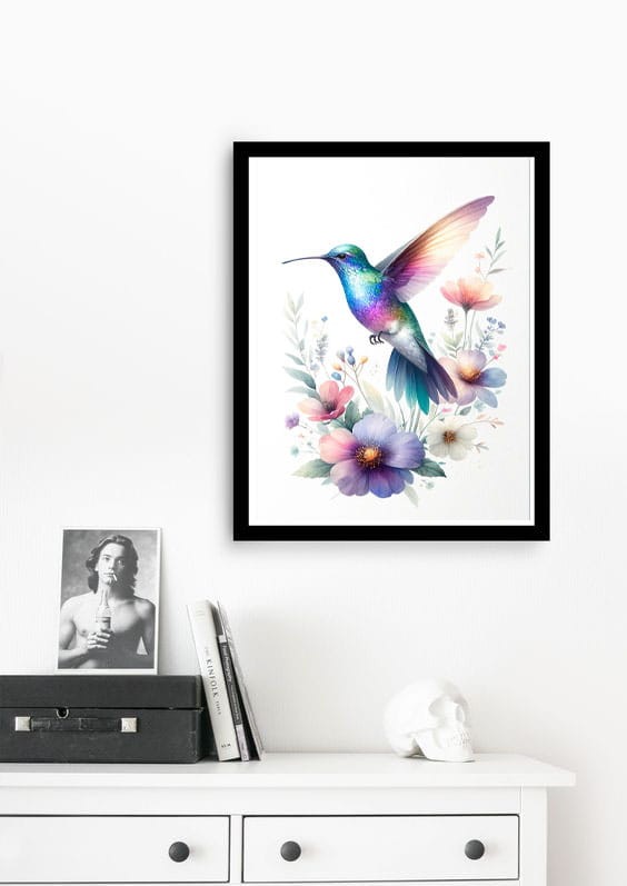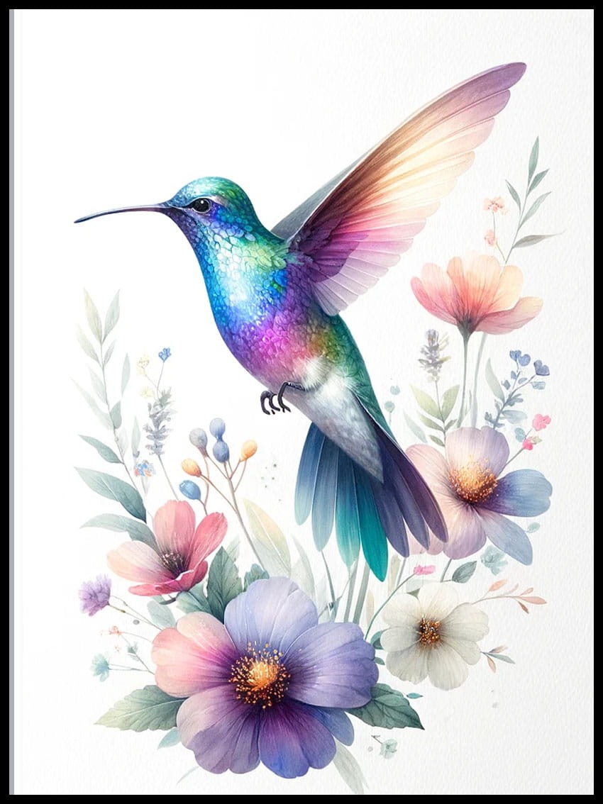 Każdy szczegół – od migoczących skrzydeł tych maleńkich ptaków po bogactwo kolorowych kwiatów – oddaje harmonię i spokój natury.