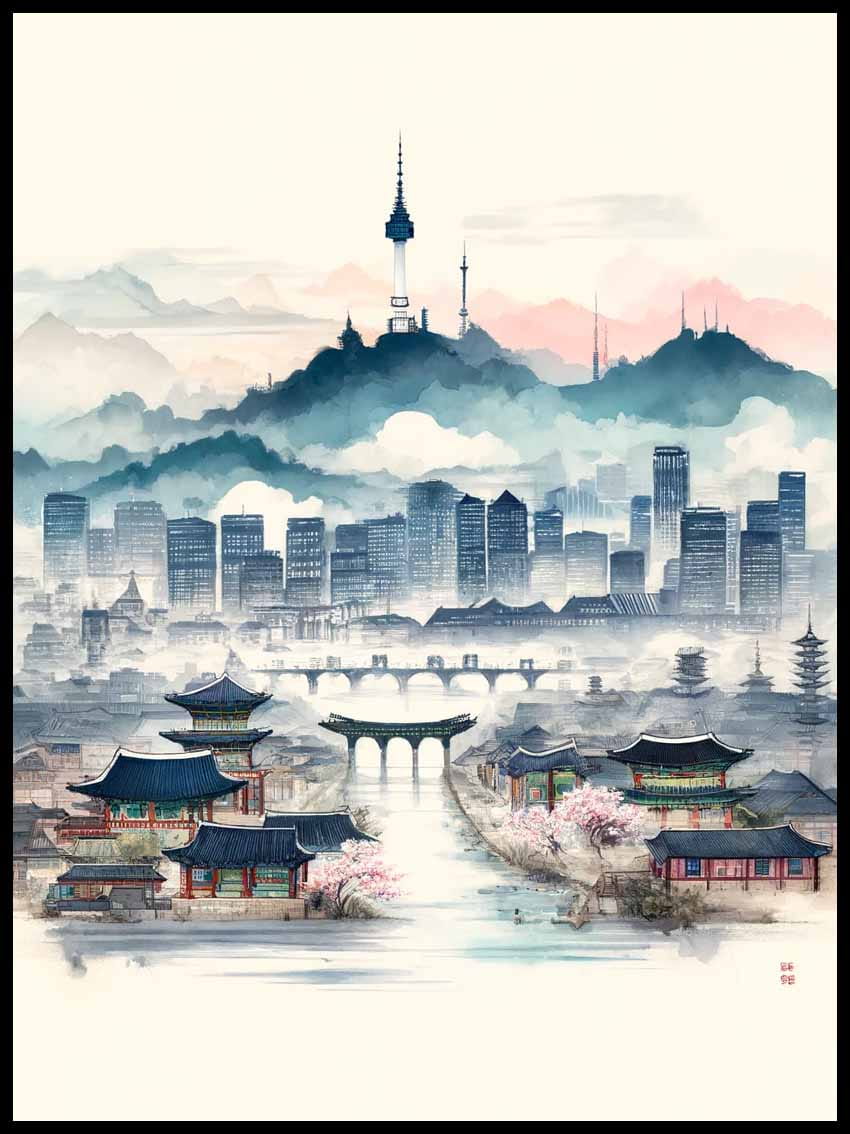 Każdy szczegół na tym plakacie został starannie przemyślany, aby oddać wielowymiarowość Seulu - od szczytów wież Namsan Tower po spokojne brzegi rzeki Han, oferując widok, który jest zarazem intymny, jak i rozległy. Kolory i tekstury zostały zręcznie dobrane, aby oddać żywiołowość miasta i jego nieustającą zmienność, uchwycić jego rytm i pulsujące życie.