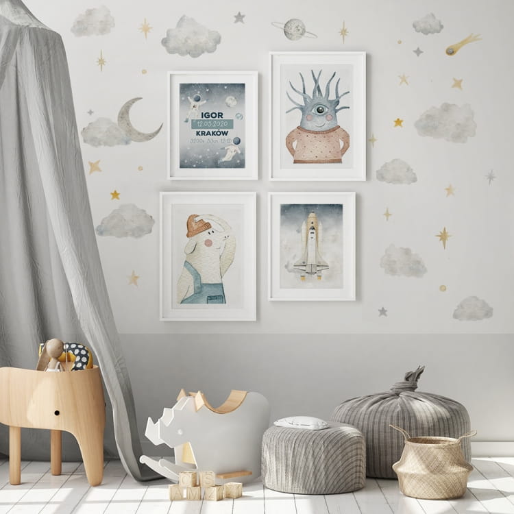 Do plakatu można dobrać pięknie pasująca drukowaną naklejkę na ścianę z kolekcji Kosmos.
