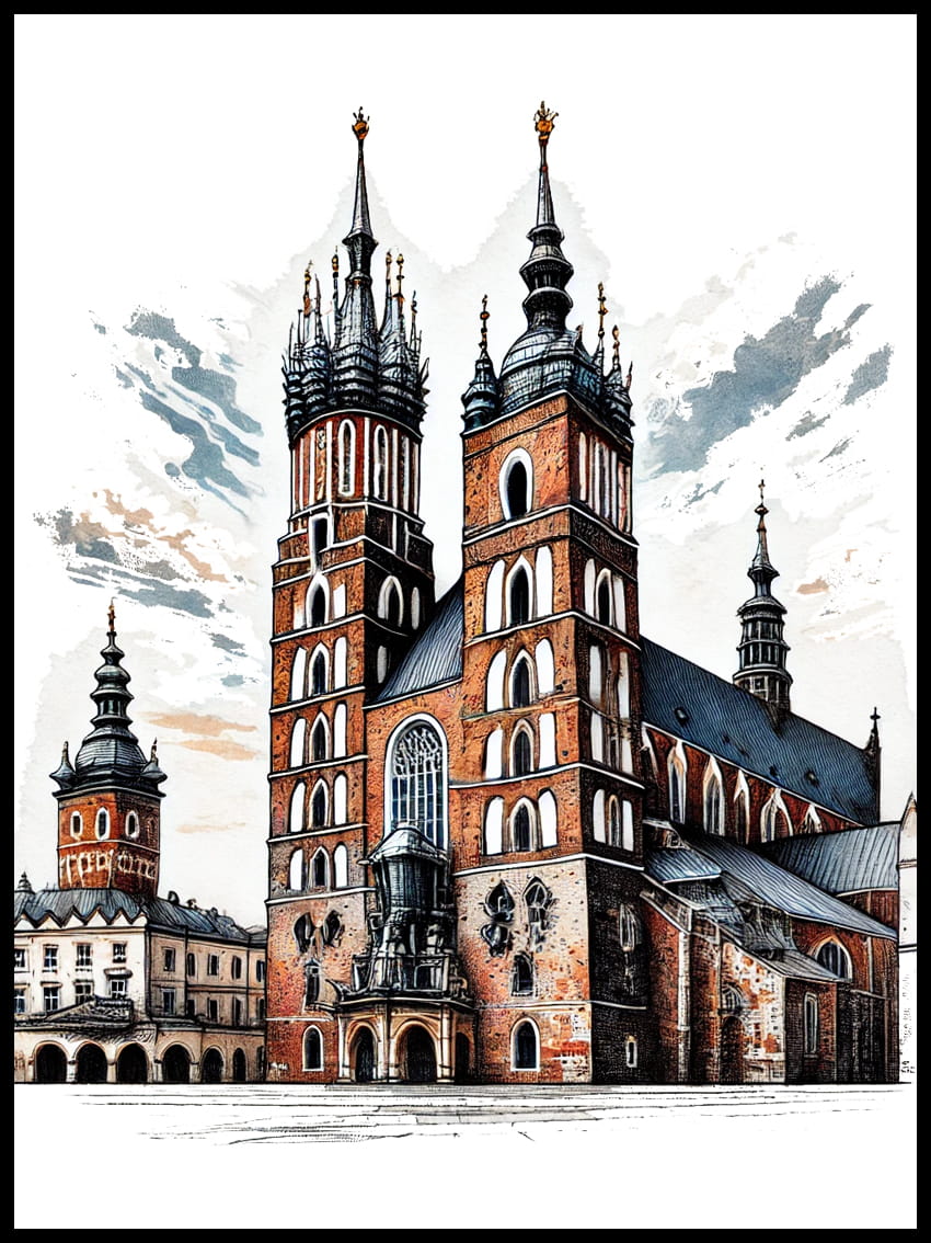 Odkryj wyjątkowy plakat przedstawiający Bazylikę Mariacką – jedną z najpiękniejszych pereł architektury Krakowa.