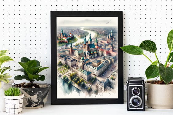 Plakat, Kraków z lotu ptaka- akwarela