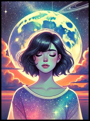 Przenieś się do świata pełnego spokoju i naturalnego piękna dzięki plakatowi przedstawiającemu dziewczynę na tle księżyca.