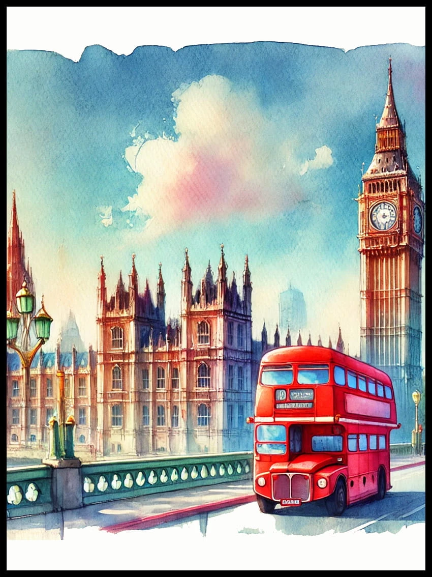 Wprowadź do swojego wnętrza atmosferę londyńskich ulic dzięki plakatowi „Londyn – Czerwony Autobus” wykonanemu techniką akwareli. Charakterystyczny dwupoziomowy autobus, symbol brytyjskiej stolicy, został uchwycony z niezwykłą finezją, w otoczeniu delikatnych, akwarelowych barw, które nadają scenie lekkości i nostalgicznego uroku.