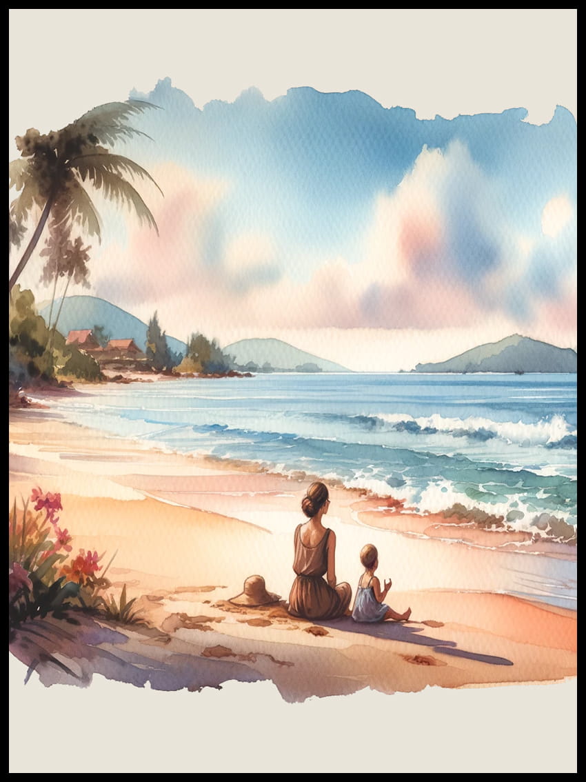 Plakat, Mama z dzieckiem na plaży - akwarela