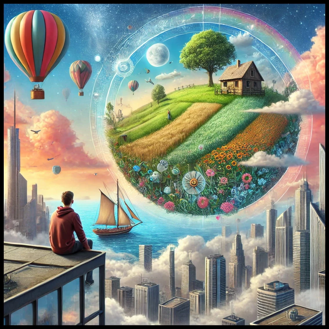 "Marzenia" to plakat, który przenosi do świata wyobraźni, pełnego barw i emocji. Przedstawia chłopca zatopionego w refleksji, siedzącego pośród malowniczej, kolorowej przestrzeni.