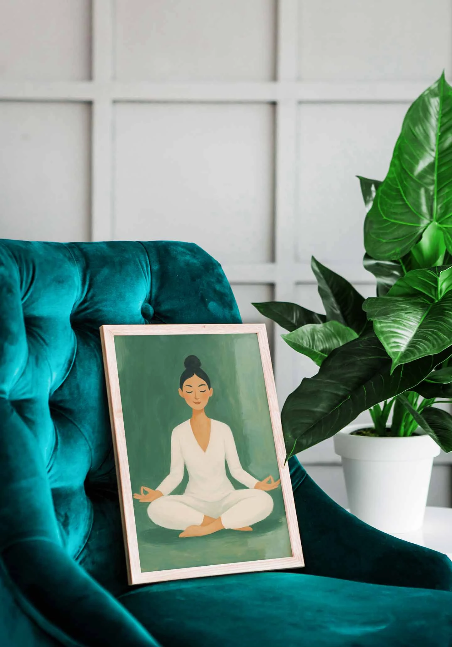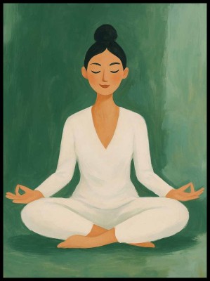W prostocie tkwi siła. Ten plakat to subtelna, a zarazem wyrazista afirmacja spokoju, harmonii i skupienia. Ukazuje kobietę pogrążoną w medytacji, ubraną w biały strój, na tle kojącej zieleni.