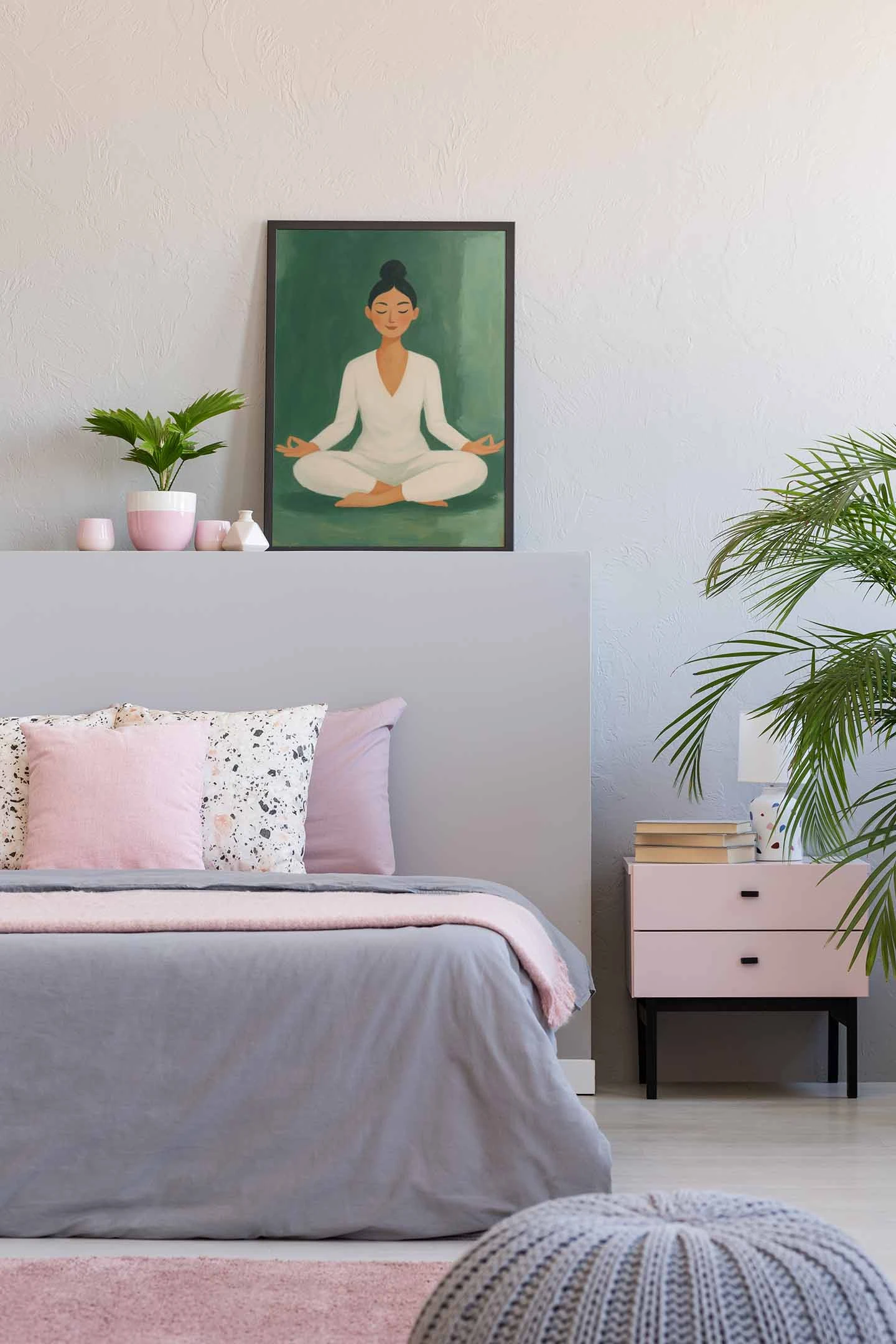 Plakat "Medytacja" doskonale odnajdzie się w przestrzeniach, które służą relaksowi i wyciszeniu – w domowym gabinecie, sypialni, salonie jogi czy strefie wellness.