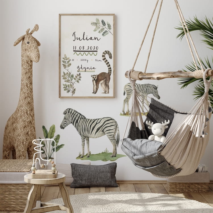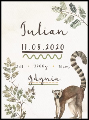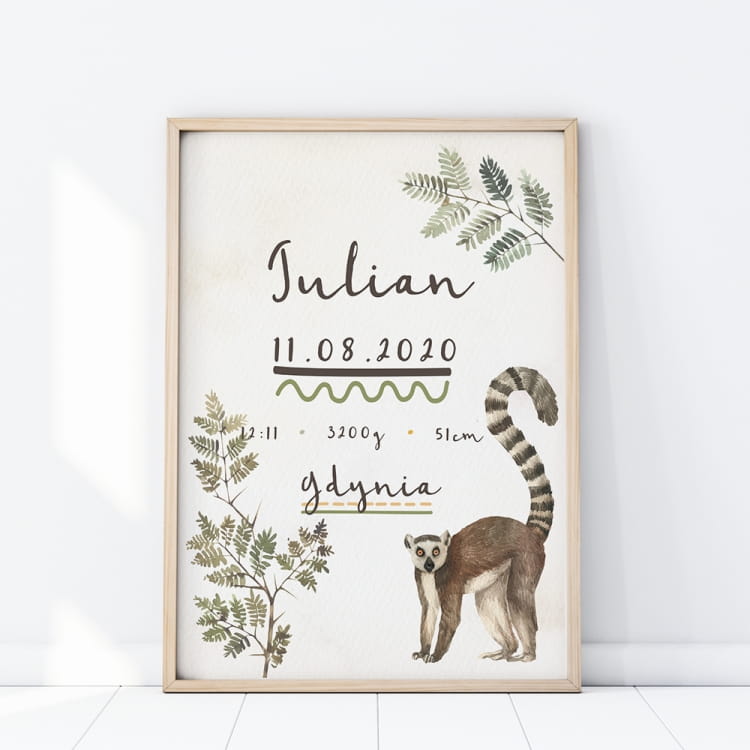 Drukowana metryczka z lemurem, będzie wyjątkową pamiątką lub prezentem.