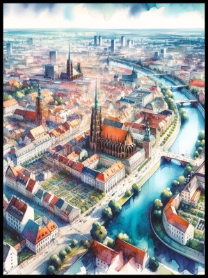 Na pierwszym planie tego lotniczego pejzażu dominuje rzeka Odra, której wijące się koryto przecina miasto, tworząc malownicze wyspy i mosty. Subtelne pociągnięcia pędzla i przejrzyste warstwy akwareli oddają błękit wód rzeki oraz zielone obszary nadbrzeżne, dodając kompozycji głębi i naturalnego uroku.