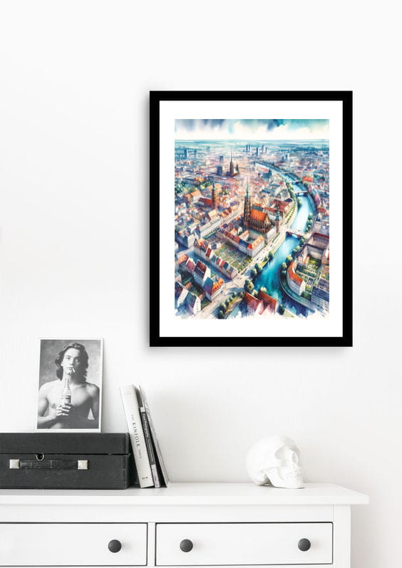 Ten plakat z Wrocławiem to nie tylko zachwycający widok na jedno z najpiękniejszych polskich miast, ale także hołd dla jego złożonej historii i kulturowego bogactwa. Idealny dla miłośników Wrocławia, sztuki, czy architektury, będzie stanowił wyróżniający się element dekoracyjny w każdym wnętrzu.