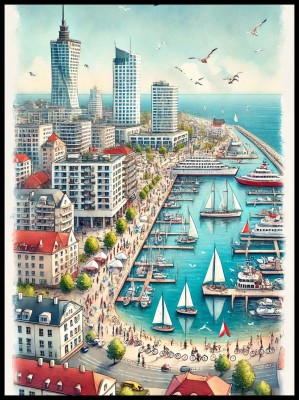 Pełen życia i kolorów plakat przedstawiający tętniącą energią Gdynię – nowoczesne miasto z charakterystyczną mariną, żaglami oraz wysokimi wieżowcami nad Bałtykiem. Detale takie jak jachty, rowerzyści, przechadzający się spacerowicze czy mewy unoszące się nad portem sprawiają, że grafika oddaje wyjątkową atmosferę letniego dnia nad morzem.