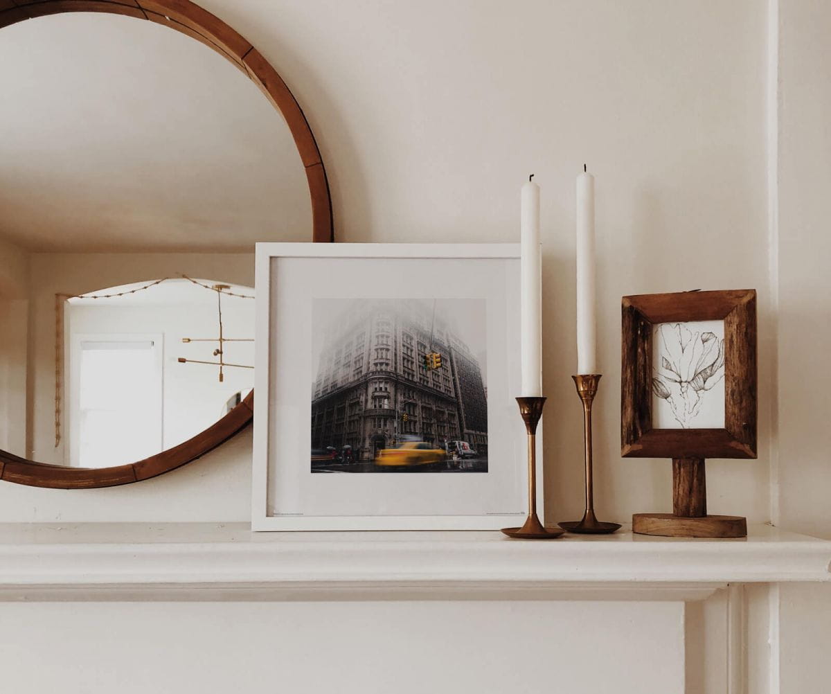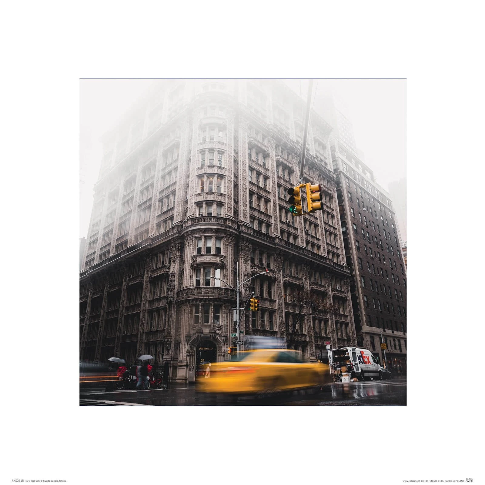 Plakat fotograficzny przedstawiający Nowy Jorki i żółtą taksówkę.