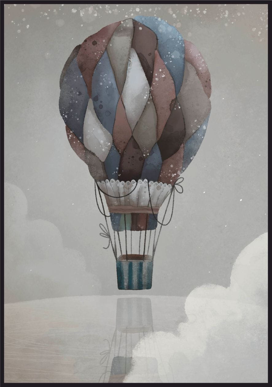 Plakat dla małego podróżnika przedstawiający niebieski balon na gorące powietrze.
