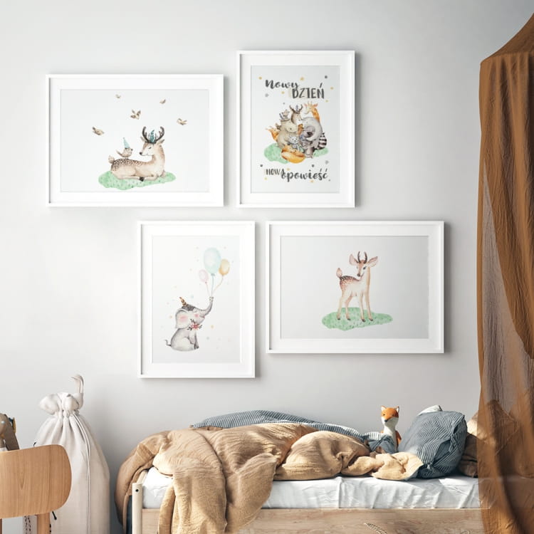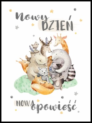 Plakat Nowy dzień, nowe opowieści ładnie pasuje do naklejek z tym motywem. Motyw Jelonka i leśnych przyjaciół pojawia się w wielu naklejkach z kolekcji leśnej.