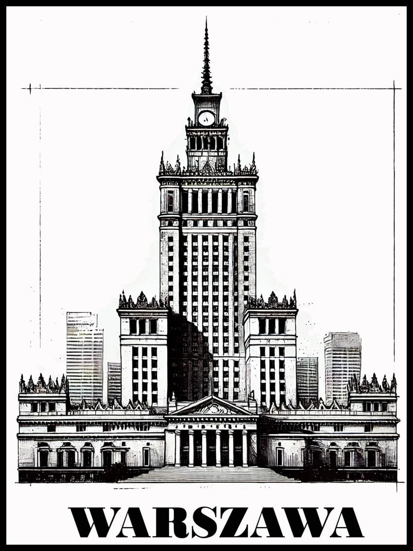 Piękna grafika autorska przedstawiająca magiczne miejsce w Warszawie Pałac Kultury i Nauki.