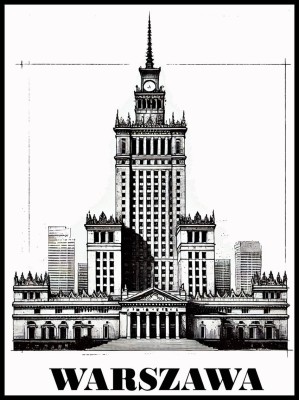 Plakat,Pałac Kultury i Nauki z napisem Warszawa