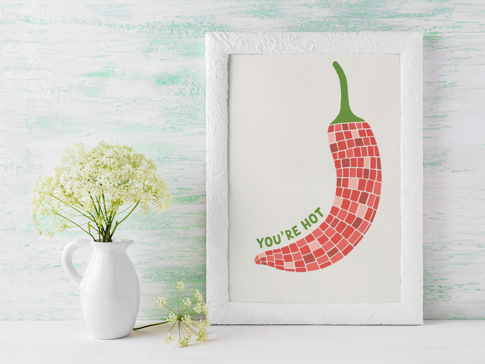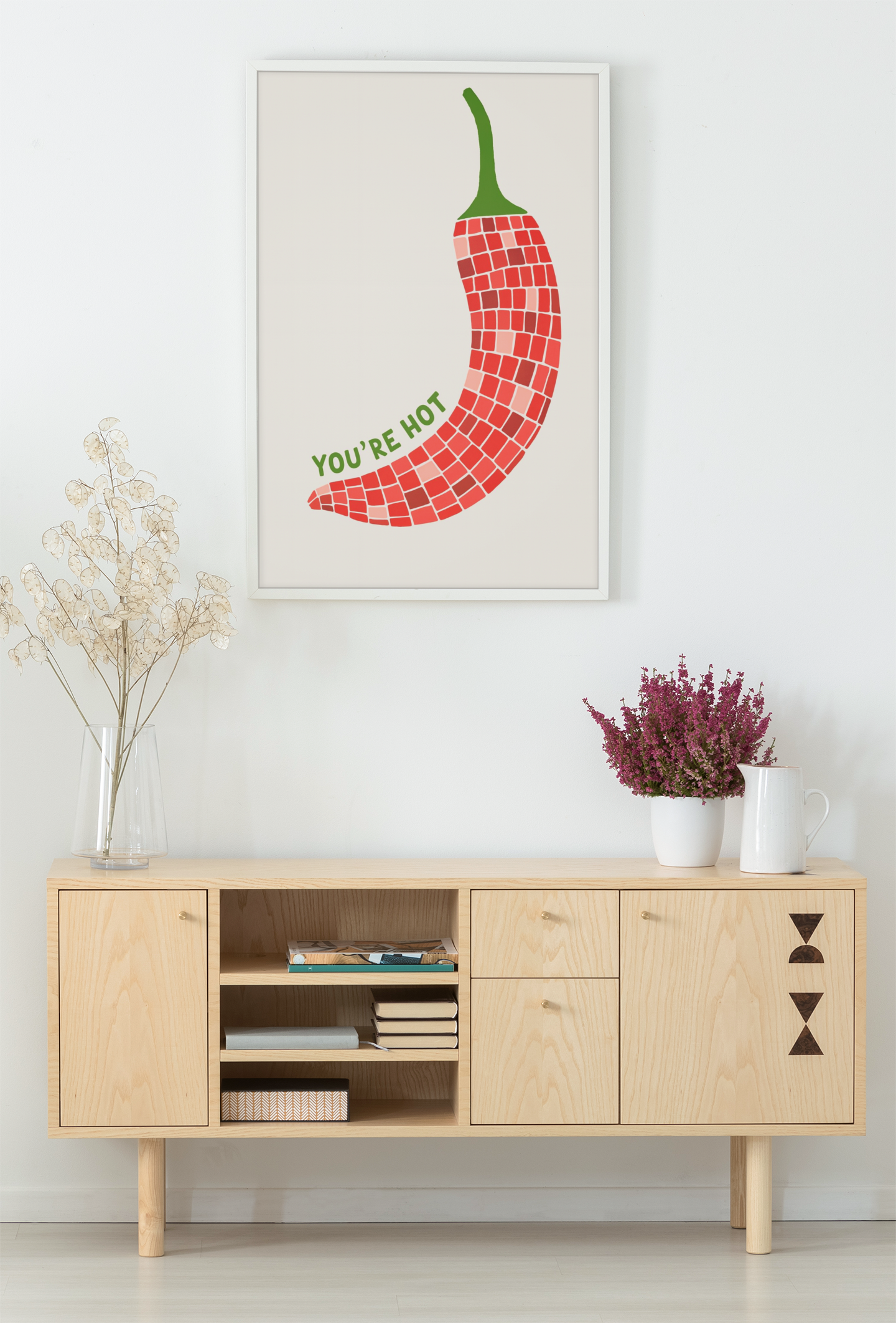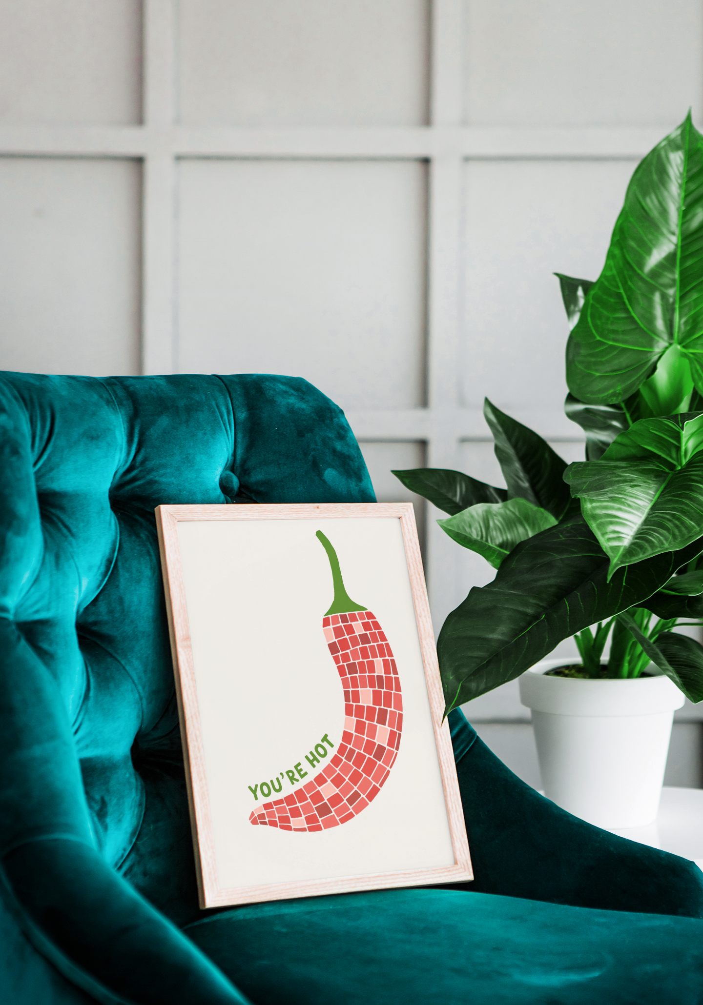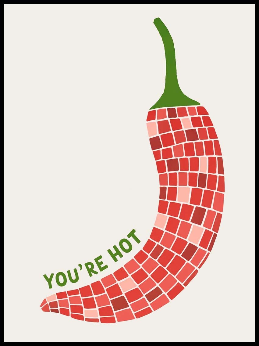 Przenieś do swojego wnętrza odrobinę szaleństwa i energetycznej zabawy! Plakat „Disco Papryczka z napisem You are hot!” to wyjątkowe połączenie kolorowej papryczki z błyskiem kultowej kuli disco.