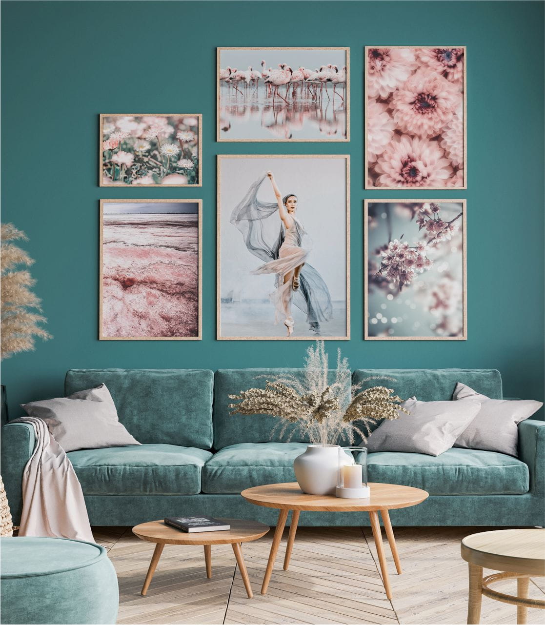 Delikatne różowe kwiaty królują na obrazach, nadając pomieszczeniu niepowtarzalnego