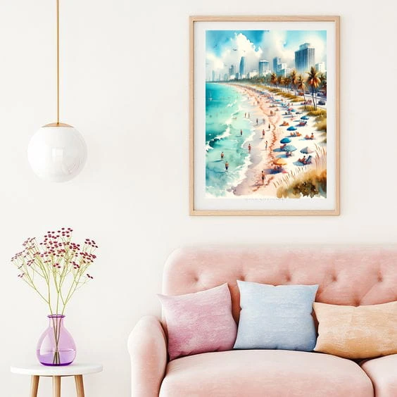Odkryj magię plaży w Miami z naszym najnowszym akwarelowym plakatem, który jest mistrzostwem subtelności i żywiołowości, wprowadzającym w przestrzeń domową atmosferę wiecznego lata.