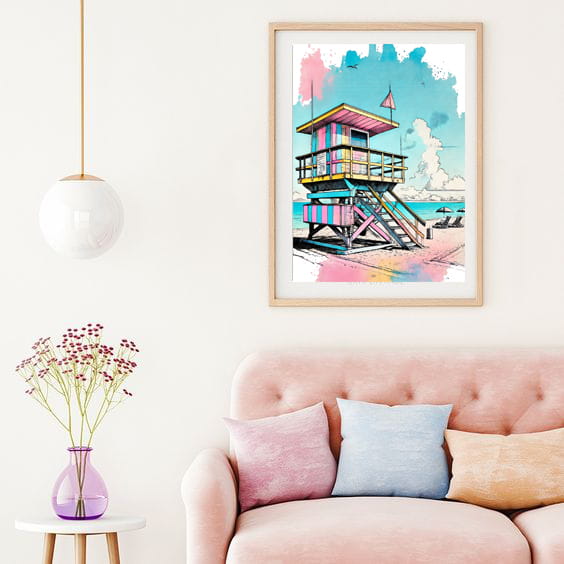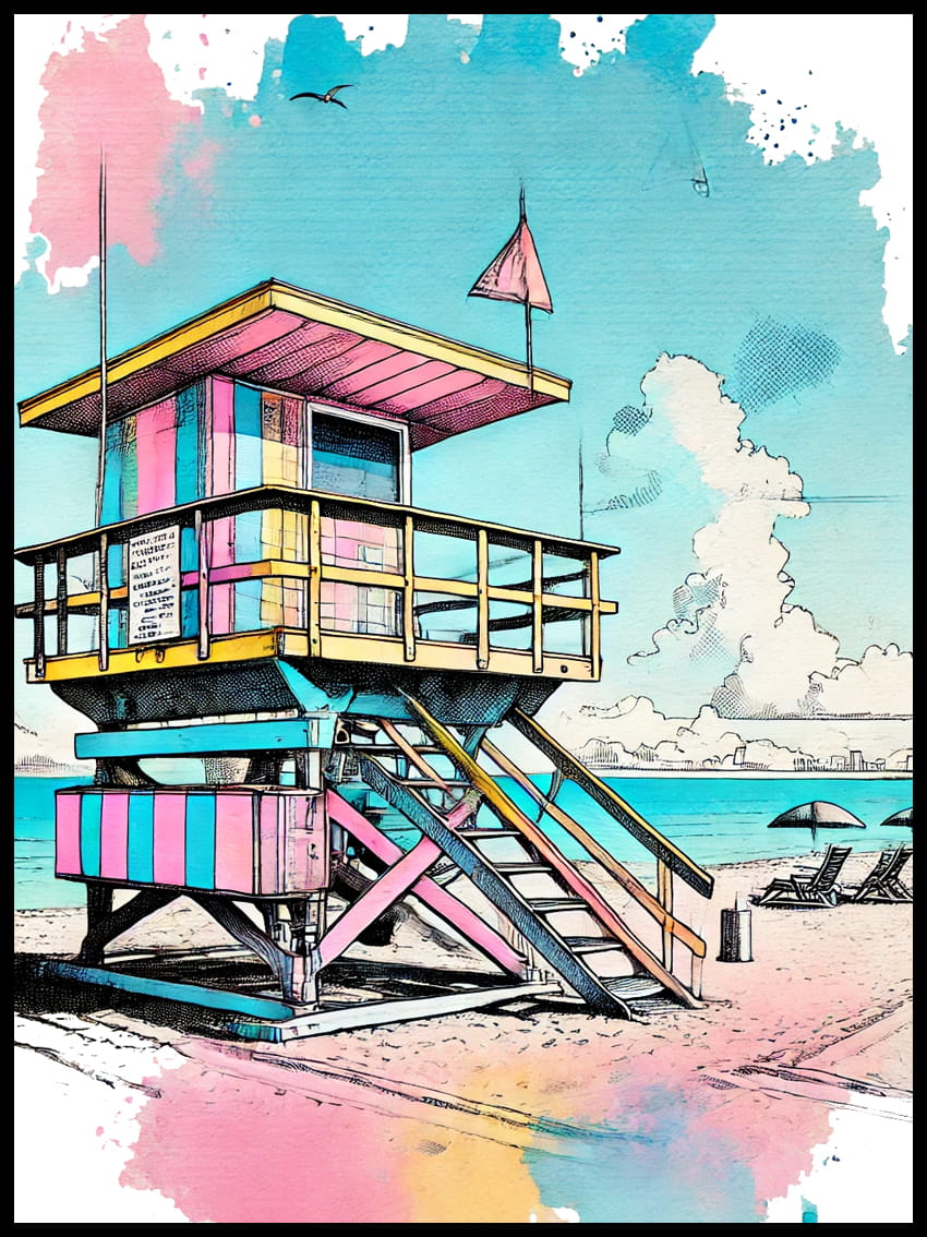 Odkryj magię plaży w Miami z naszym najnowszym akwarelowym plakatem, który jest mistrzostwem subtelności i żywiołowości, wprowadzającym w przestrzeń domową atmosferę wiecznego lata.