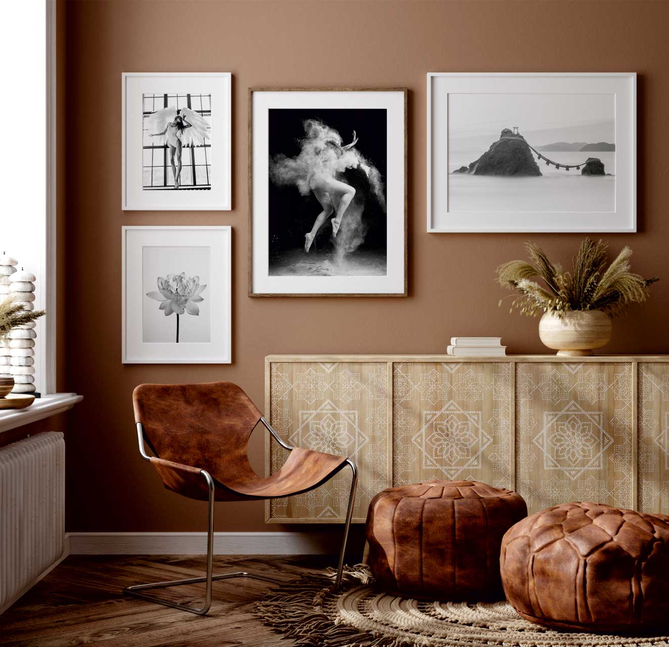 Poster "Podwodna tancerka" warto zestawić z innymi czarno-białymi zdjęciami lub ujęciami ukazującymi człowieka w ruchu.