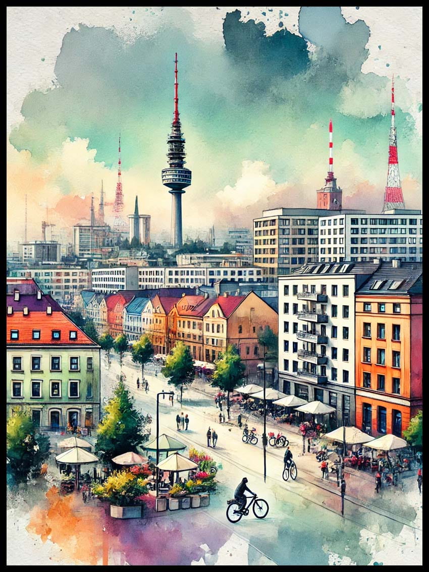 Delikatna akwarela ukazująca Gliwice to wyjątkowa propozycja dla miłośników miast z duszą.