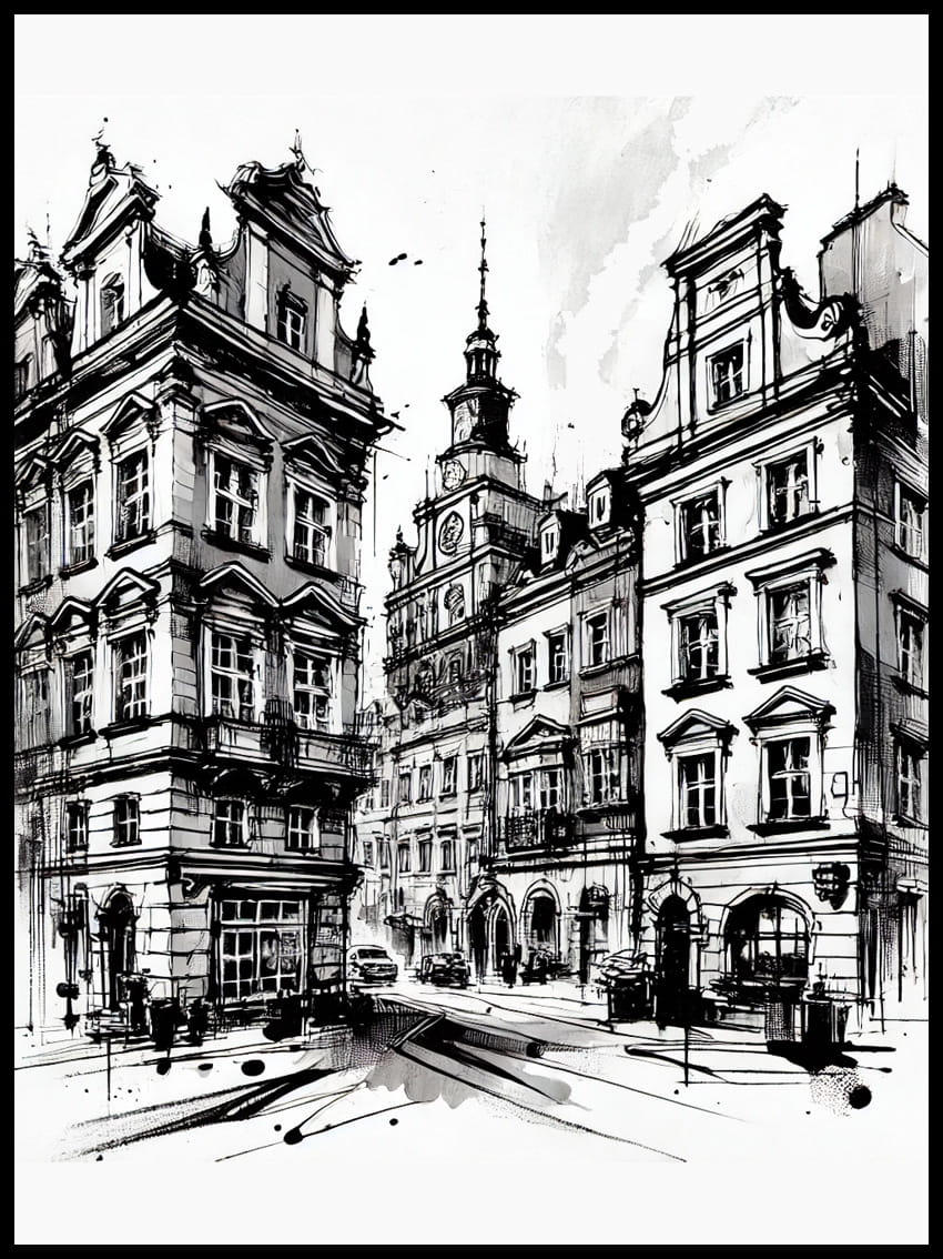 Zachwycające detale fasad, ozdobne balkony i historia zapisana w murach – ten plakat to hołd dla polskiej architektury miejskiej. Delikatny rysunek przedstawiający kamienice w jednym z polskich miast oddaje niepowtarzalny klimat staromiejskich uliczek, gdzie przeszłość splata się z teraźniejszością.