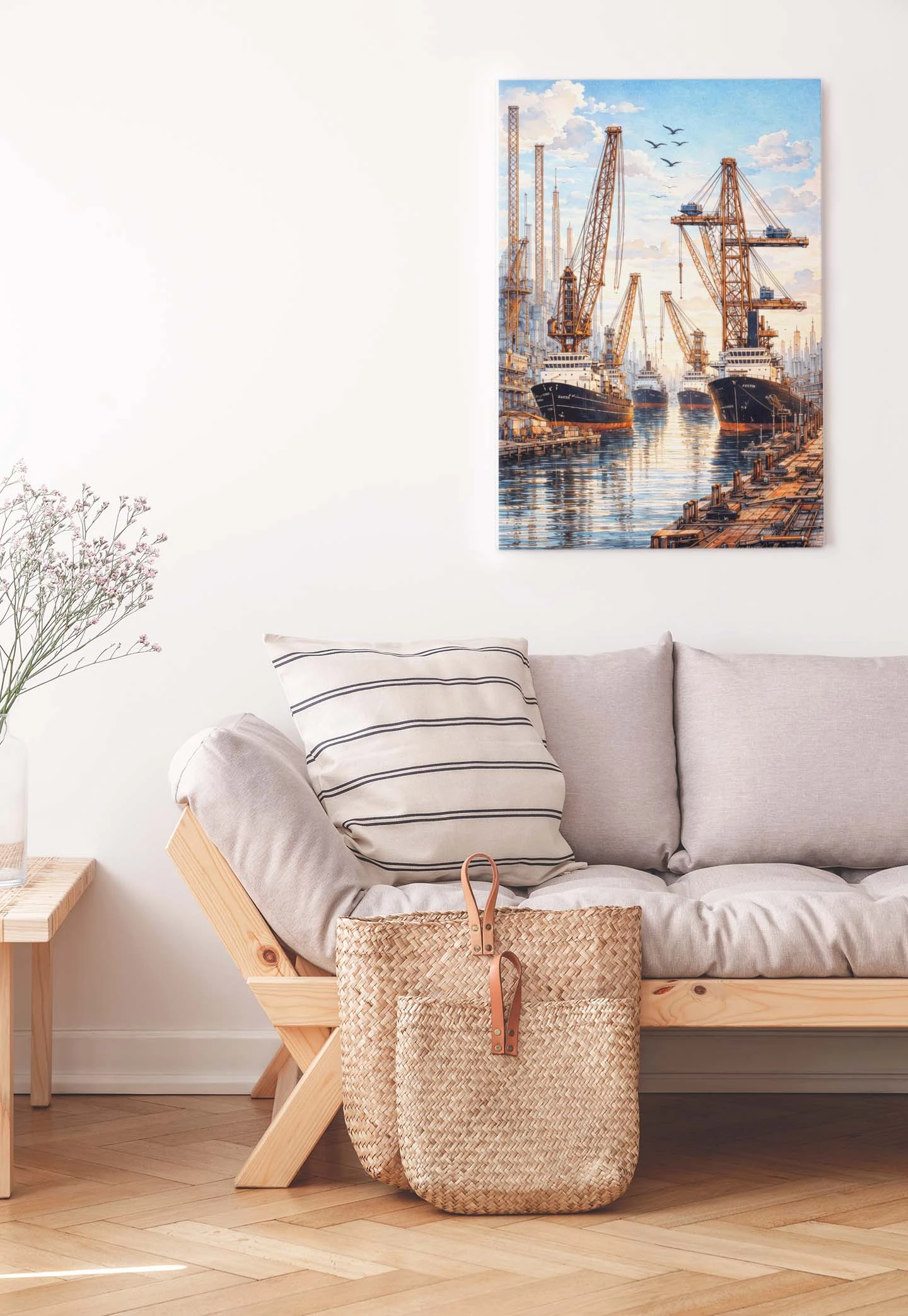 Grafika przyciąga uwagę rytmem linii, perspektywą oraz klimatem portowego miasta – symbolu pracy, siły i historii przemysłu. Plakat z motywem portu i statków świetnie sprawdzi się zarówno jako centralny punkt aranżacji, jak i element większej galerii plakatów.