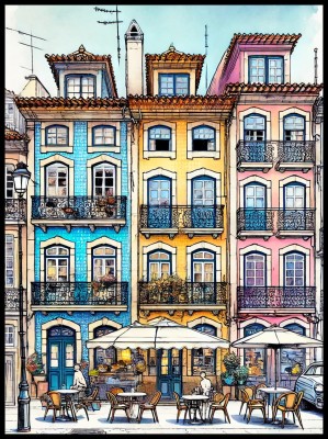 Niebo jest jasne i słoneczne, co podkreśla żywe kolory sceny. Plakat łączy w sobie vintage'owy urok z nowoczesnym designem, idealnie nadając się do dekoracji każdego wnętrza, szczególnie dla miłośników podróży i kultury portugalskiej.