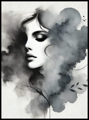 Nowoczesny plakat na ścianę z grafiką autorską, które przedstawia kobietę w czarnych barwach.