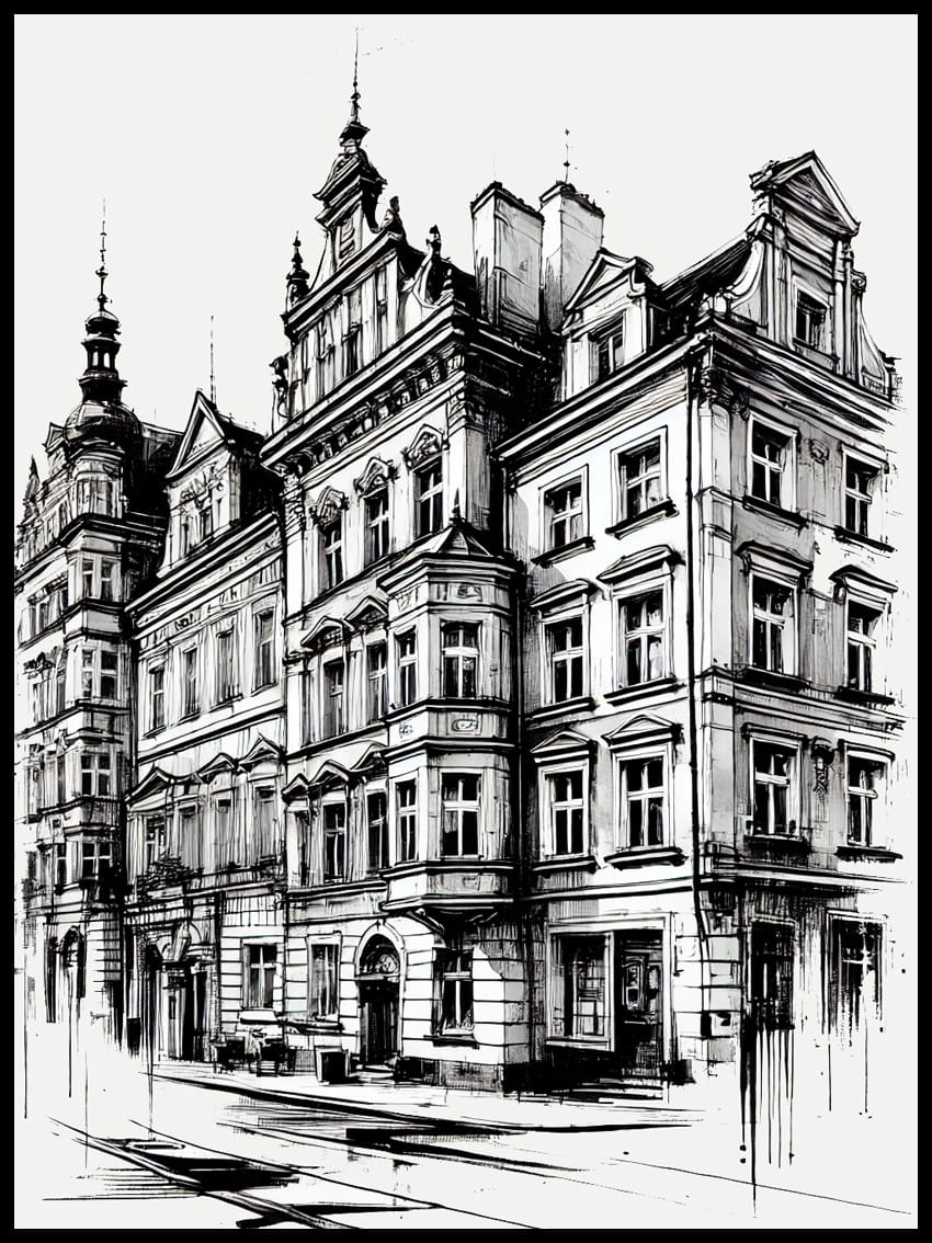 Nowoczesny plakat na ścianę – Miasto Poznań - kamienice rysunek- nada charakter Twojemu wnętrzu.