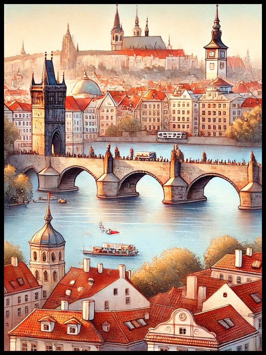 Niech Twoje spojrzenie podąży za krętymi konturami Wełtawy, z której brzegów wyłania się majestatyczny Zamek Praski – symbol władzy i historii. Daj się ponieść wyobraźni, słuchając echa złotych wieków, które odbijają się echem w murach tej starożytnej fortecy.