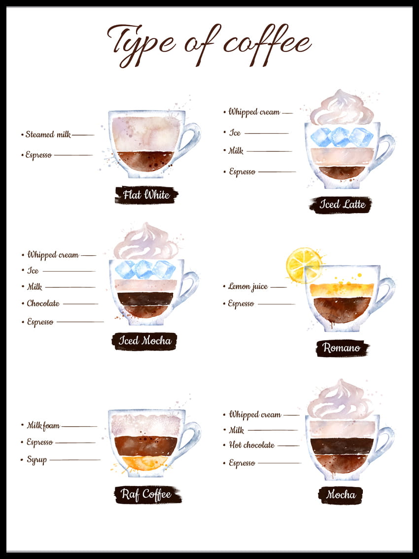 Nowoczesny plakat na ścianę – Rodzaje kawy Iced- nada charakter Twojemu wnętrzu.