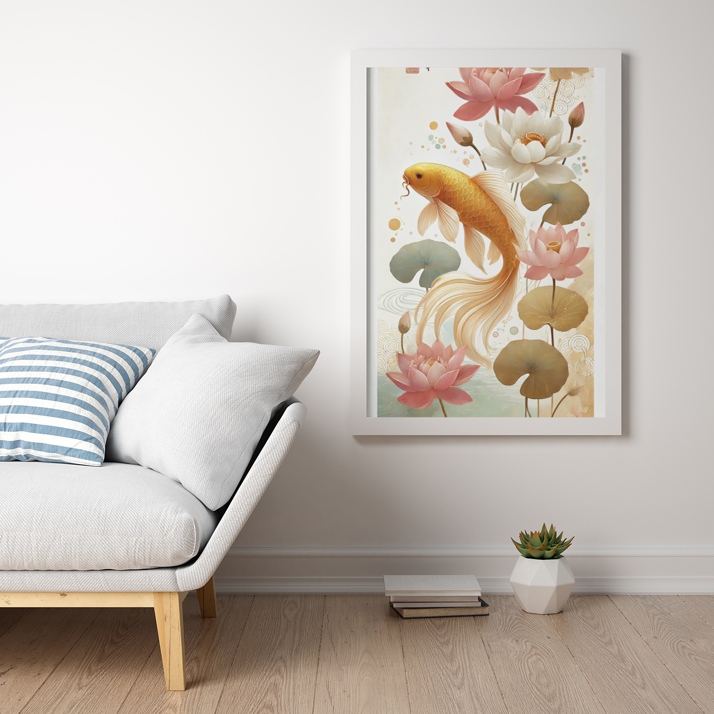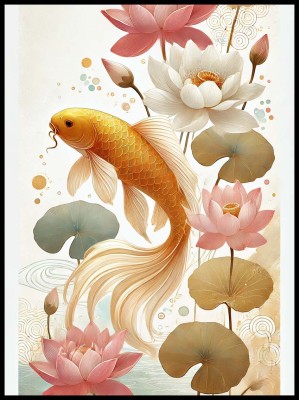 Intensywne, żywe kolory ryby koi kontrastują z łagodnym tłem wodnym, co sprawia, że każdy detal tego plakatu jest wyraźny i pełen życia.