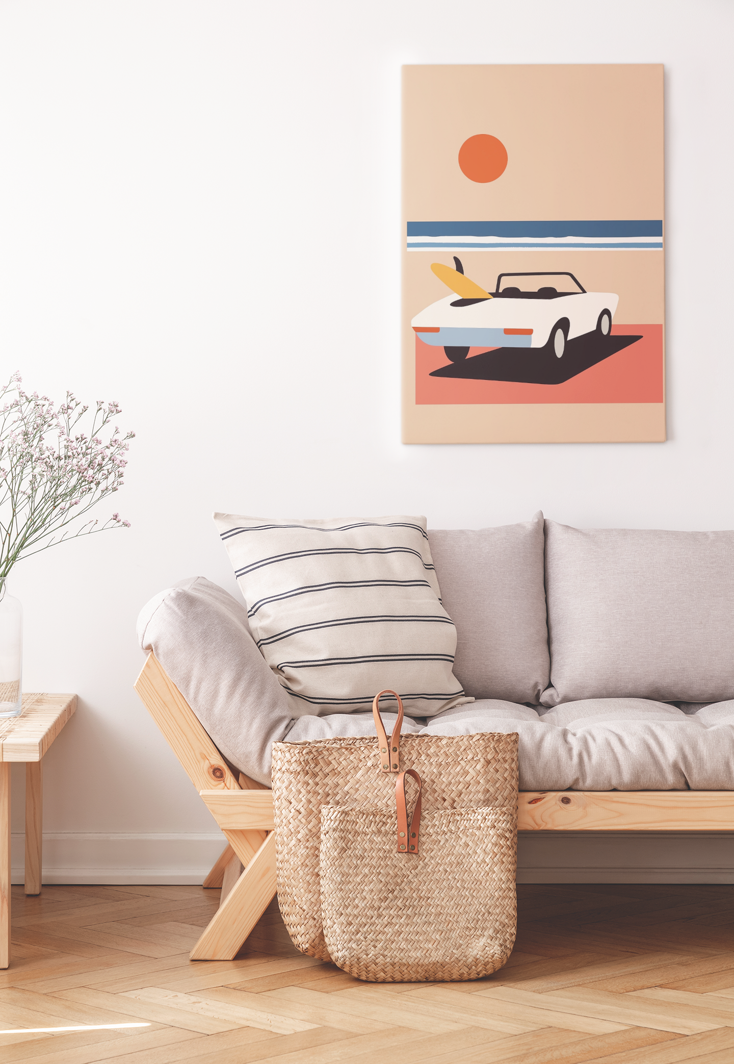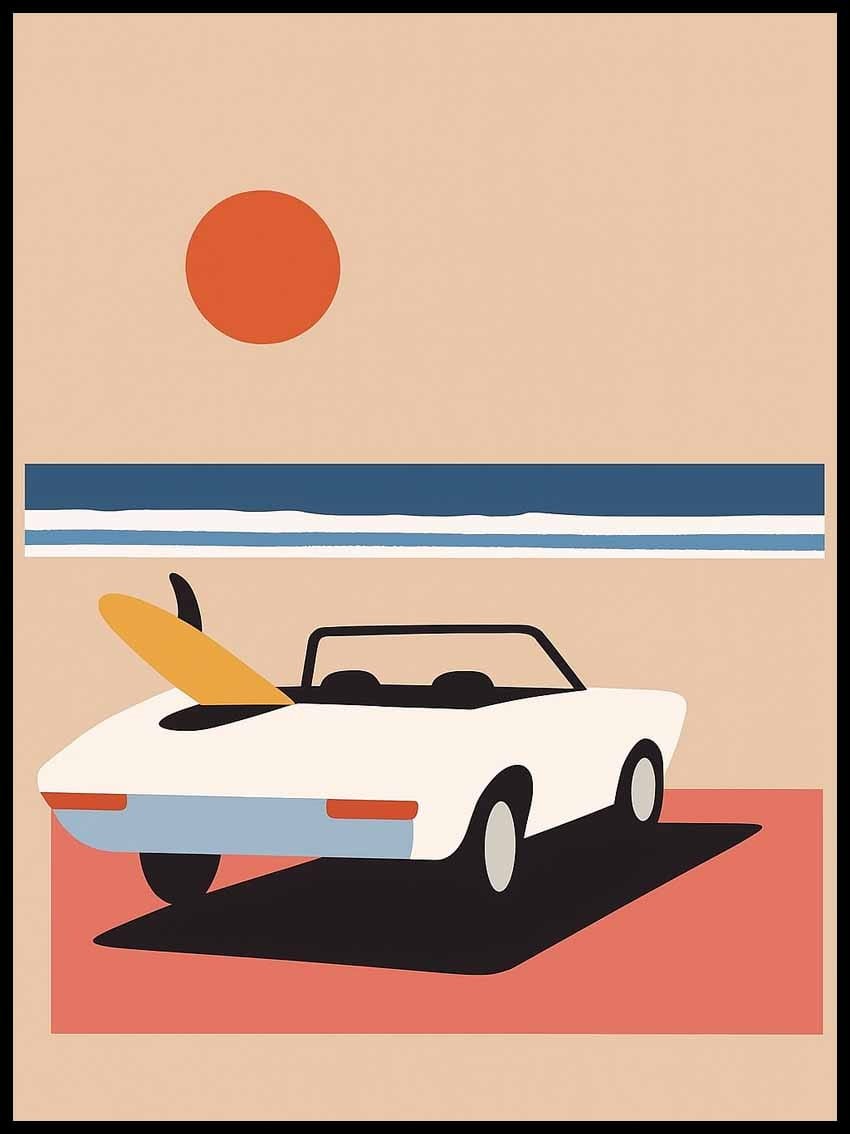 Ten piękny plakat autorski przedstawia klasyczny, retro van zaparkowany na plaży, z rozległym oceanem rozciągającym się po horyzont. Subtelne, pastelowe barwy nadają kompozycji spokojny, nostalgiczny charakter, który idealnie wkomponuje się w każde wnętrze, wnosząc do niego atmosferę relaksu i beztroski.