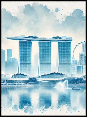 Plakat, Singapur skyline niebieski - akwarela