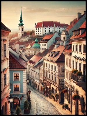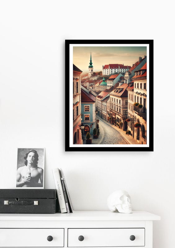 Plakat łączy tradycję z nowoczesnym designem, oddając klimat tętniących życiem uliczek starego miasta, jego zabytków i klimatycznych kawiarni. Idealny jako dekoracja salonu, biura czy sypialni – wprowadzi do wnętrza europejski wdzięk i nostalgiczne piękno podróży po Słowacji.
