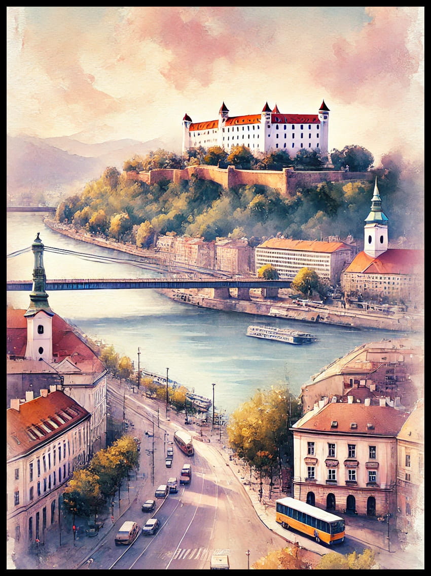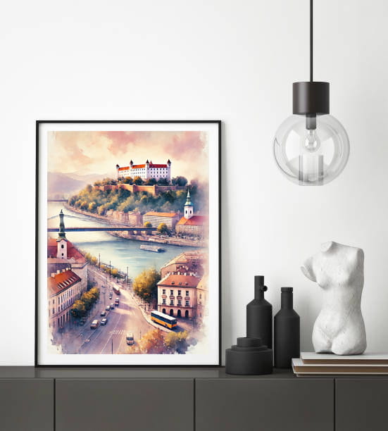 Odkryj urok słowackiej stolicy dzięki naszemu wyjątkowemu plakatowi przedstawiającemu Bratysławę. Subtelne detale, starannie dobrane kolory i artystyczna perspektywa ukazują miasto pełne historii, kultury i nowoczesnego charakteru.