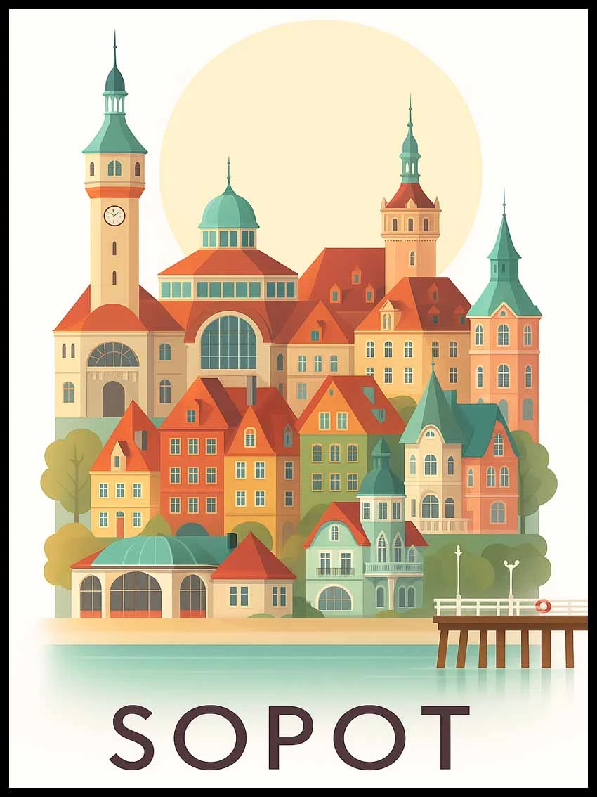 Plakat Sopot oddaje spokojną atmosferę nadmorskiego kurortu, z jego błękitnym niebem, łagodnymi falami morza i charakterystyczną architekturą. Idealny dla każdego, kto tęskni za morską bryzą lub pragnie dodać do swojego domu odrobinę sopockiego stylu.