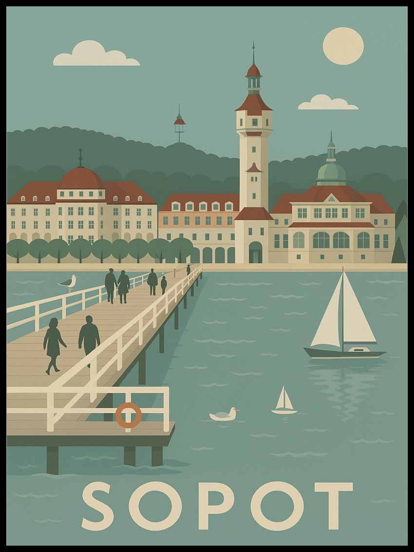 Plakat Sopot oddaje spokojną atmosferę nadmorskiego kurortu, z jego błękitnym niebem, łagodnymi falami morza i charakterystyczną architekturą. Idealny dla każdego, kto tęskni za morską bryzą lub pragnie dodać do swojego domu odrobinę sopockiego stylu.