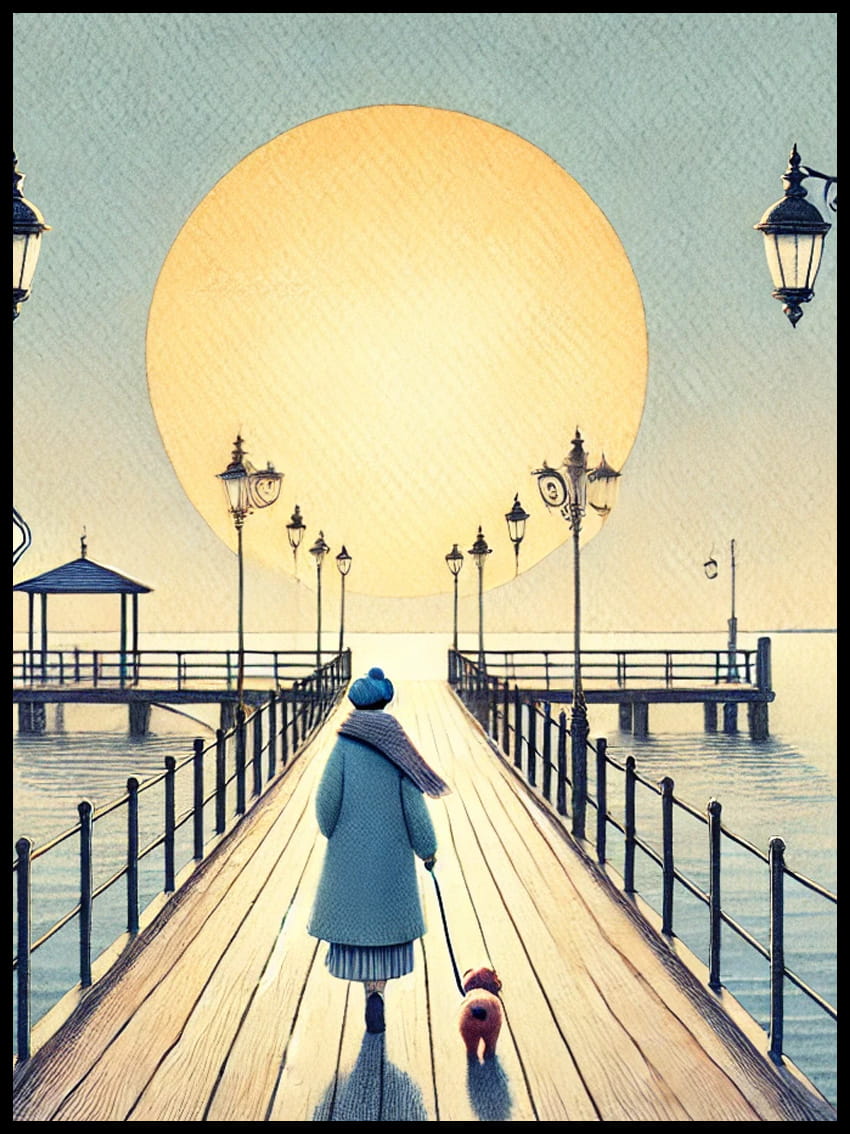Czy jest coś bardziej kojącego niż spacer po molo w towarzystwie wiernego psa? Ten wyjątkowy plakat uchwyca chwilę pełną ciszy, refleksji i bliskości z naturą. Kobieta, krocząca po drewnianym pomoście, zdaje się zatopiona w myślach, podczas gdy jej czworonożny przyjaciel towarzyszy jej z oddaniem.