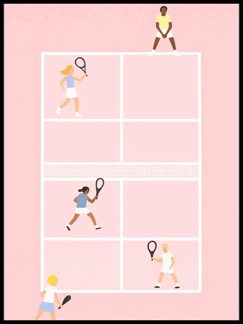 Czyste linie, spokój symetrii i klimat rodem z letnich turniejów sprzed dekad. Plakat „Kort tenisowy” to minimalistyczna, ale mocna graficzna forma, która oddaje ducha klasycznego sportu i stylu. Utrzymany w tonacji retro, z wyważoną paletą barw – ten plakat wprowadza do wnętrza elegancki luz i odrobinę sportowej nostalgii.