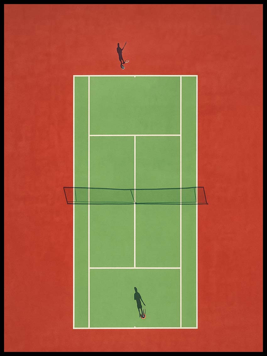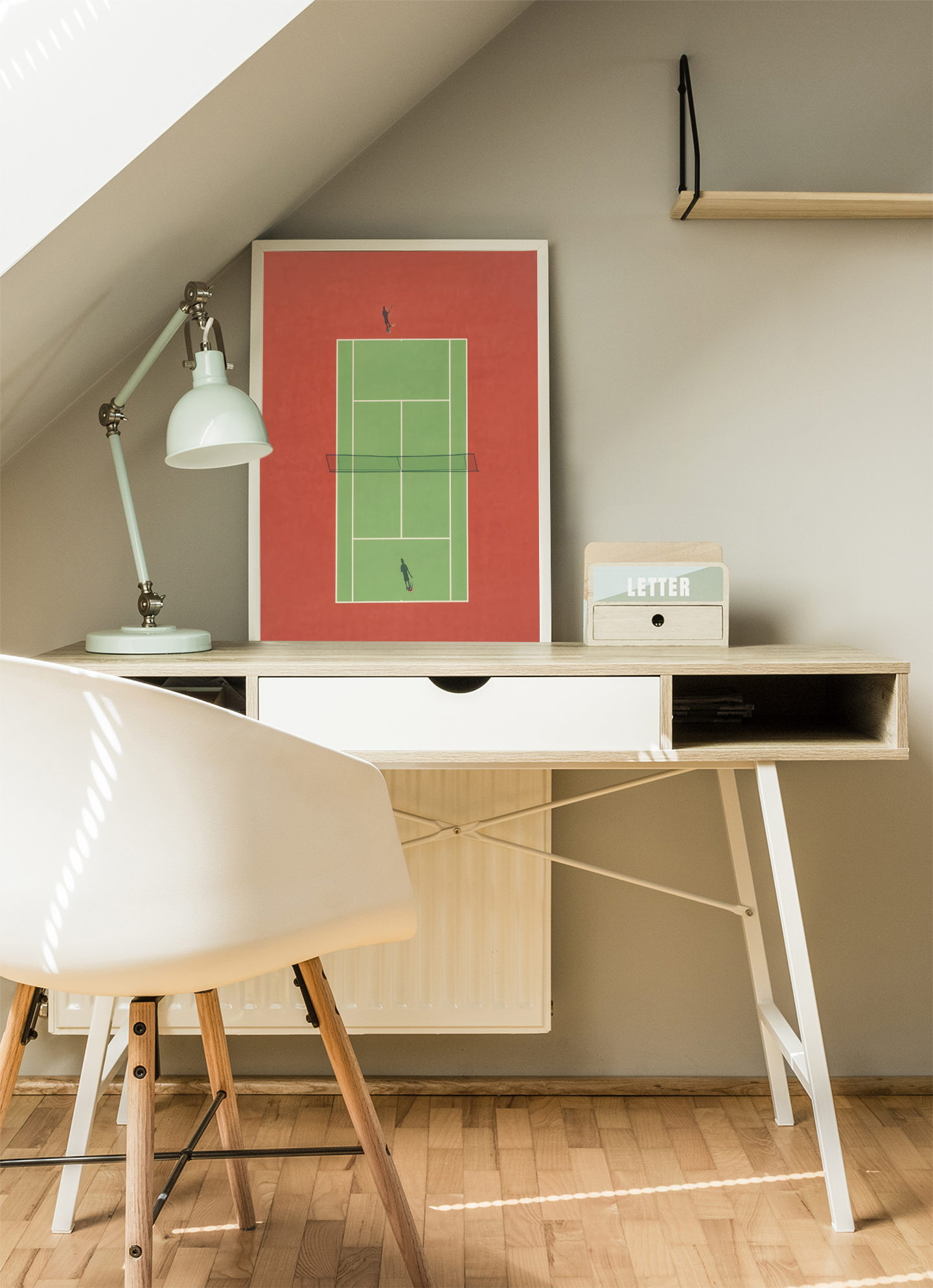 Czyste linie, spokój symetrii i klimat rodem z letnich turniejów sprzed dekad. Plakat „Kort tenisowy” to minimalistyczna, ale mocna graficzna forma, która oddaje ducha klasycznego sportu i stylu. Utrzymany w tonacji retro, z wyważoną paletą barw – ten plakat wprowadza do wnętrza elegancki luz i odrobinę sportowej nostalgii.