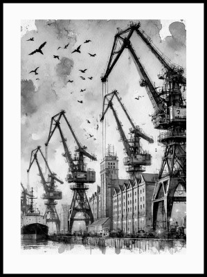 Gdańsk, miasto o bogatej historii i unikalnej architekturze, jest także domem dla imponujących konstrukcji, które odzwierciedlają jego postindustrialny charakter. Na tym wyjątkowym plakacie uchwycono esencję Gdańska przez pryzmat jego charakterystycznych dźwigów portowych, które rysują się na tle miasta, tworząc unikalny krajobraz łączący tradycję z nowoczesnością.