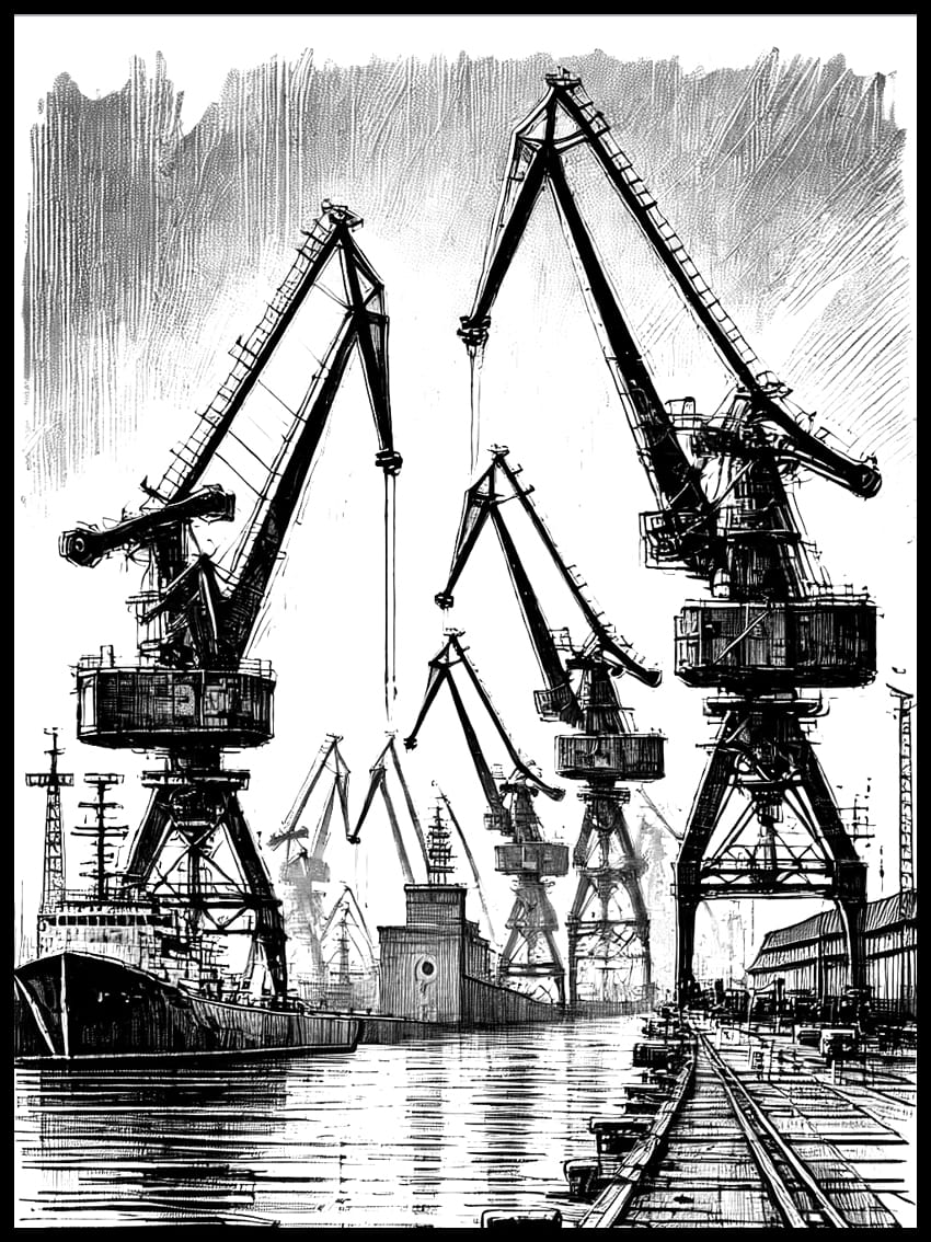 Plakat przedstawiający Stocznię w Gdańsku w czarnej kresce to hołd dla industrialnej historii i wyjątkowego charakteru tego miejsca.