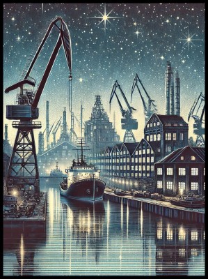Gdańsk, miasto o bogatej historii i unikalnej architekturze, jest także domem dla imponujących konstrukcji, które odzwierciedlają jego postindustrialny charakter. Na tym wyjątkowym plakacie uchwycono esencję Gdańska przez pryzmat jego charakterystycznych dźwigów portowych, które rysują się na tle miasta, tworząc unikalny krajobraz łączący tradycję z nowoczesnością.