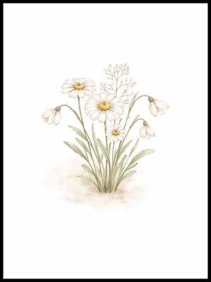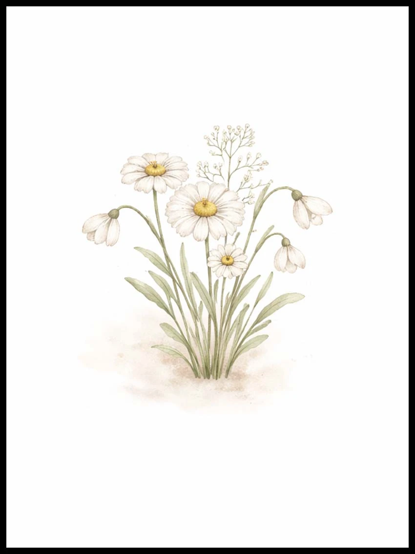 Subtelny plakat z motywem stokrotek to idealna dekoracja ścienna dla miłośników natury, minimalizmu i stylu vintage. Delikatna ilustracja w pastelowych barwach przedstawia polne kwiaty w lekkiej, akwarelowej formie, która wprowadza do wnętrza spokój i harmonię.